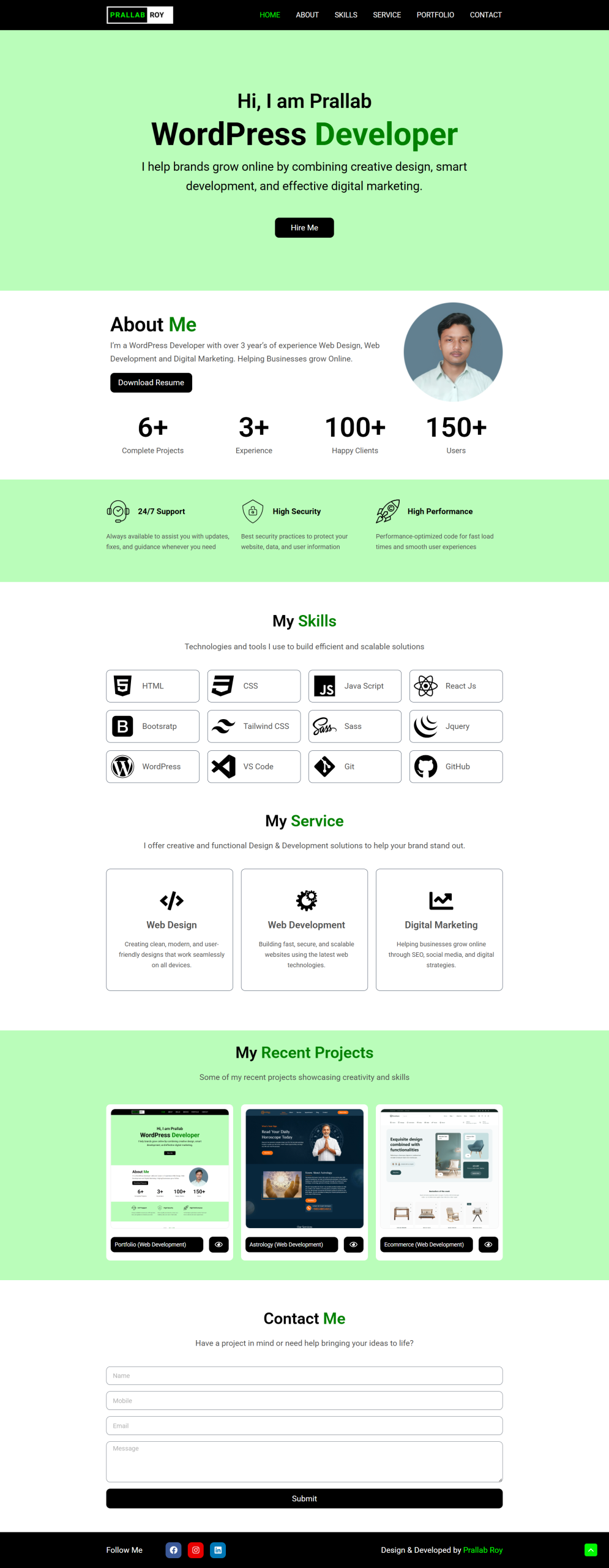 Hi, I am Prallab WordPress Developer Lorem ipsum dolor sit amet, consectetur adipiscing elit. Ut elit tellus, luctus nec ullamcorper mattis, pulvinar dapibus leo. About Me I’m a WordPress Developer with over 3 year’s of experience Web Design, Web Development and Digital Marketing. Helping Businesses grow Online. Download Resume Complete Projects 0 + Experience 0 + Happy Clients 0 + Users 0 + 24/7 Support Always available to assist you with updates, fixes, and guidance whenever you need High Security Best security practices to protect your website, data, and user information High Performance Performance-optimized code for fast load times and smooth user experiences My Skills Technologies and tools I use to build efficient and scalable solutions HTML CSS Java Script React Js Bootsratp Tailwind CSS icon Tailwind CSS Sass Jquery WordPress VS Code Git GitHub My Service I offer creative and functional Design & Development solutions to help your brand stand out. Web Design Creating clean, modern, and user-friendly designs that work seamlessly on all devices. Web Development Building fast, secure, and scalable websites using the latest web technologies. Digital Marketing Helping businesses grow online through SEO, social media, and digital strategies. My Recent Projects Some of my recent projects showcasing creativity and skills Portfolio (Web Development) Astrology (Web Development) Ecommerce (Web Development) Contact Me Have a project in mind or need help bringing your ideas to life? Name Mobile Email Message Submit